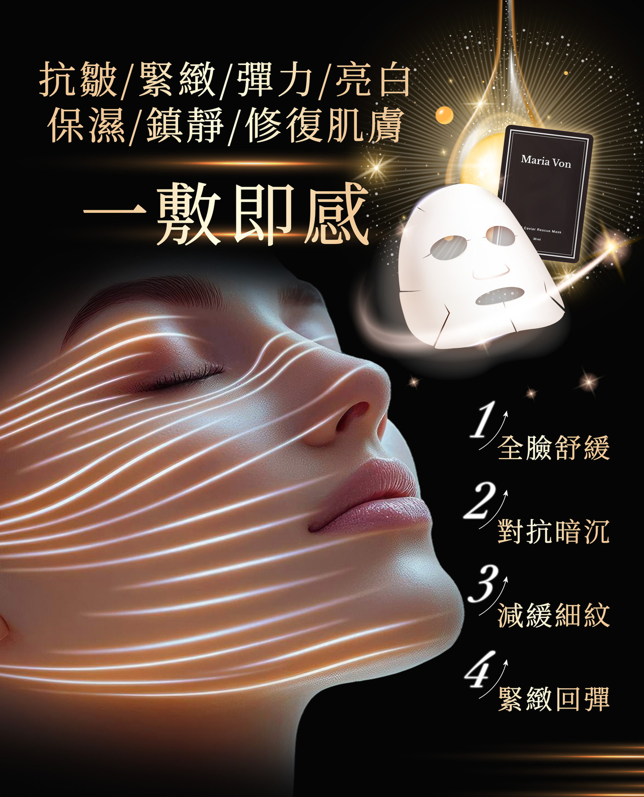 特色:快速鎮定舒緩、深層修復並補充膠原,達到明亮光滑保濕的效果