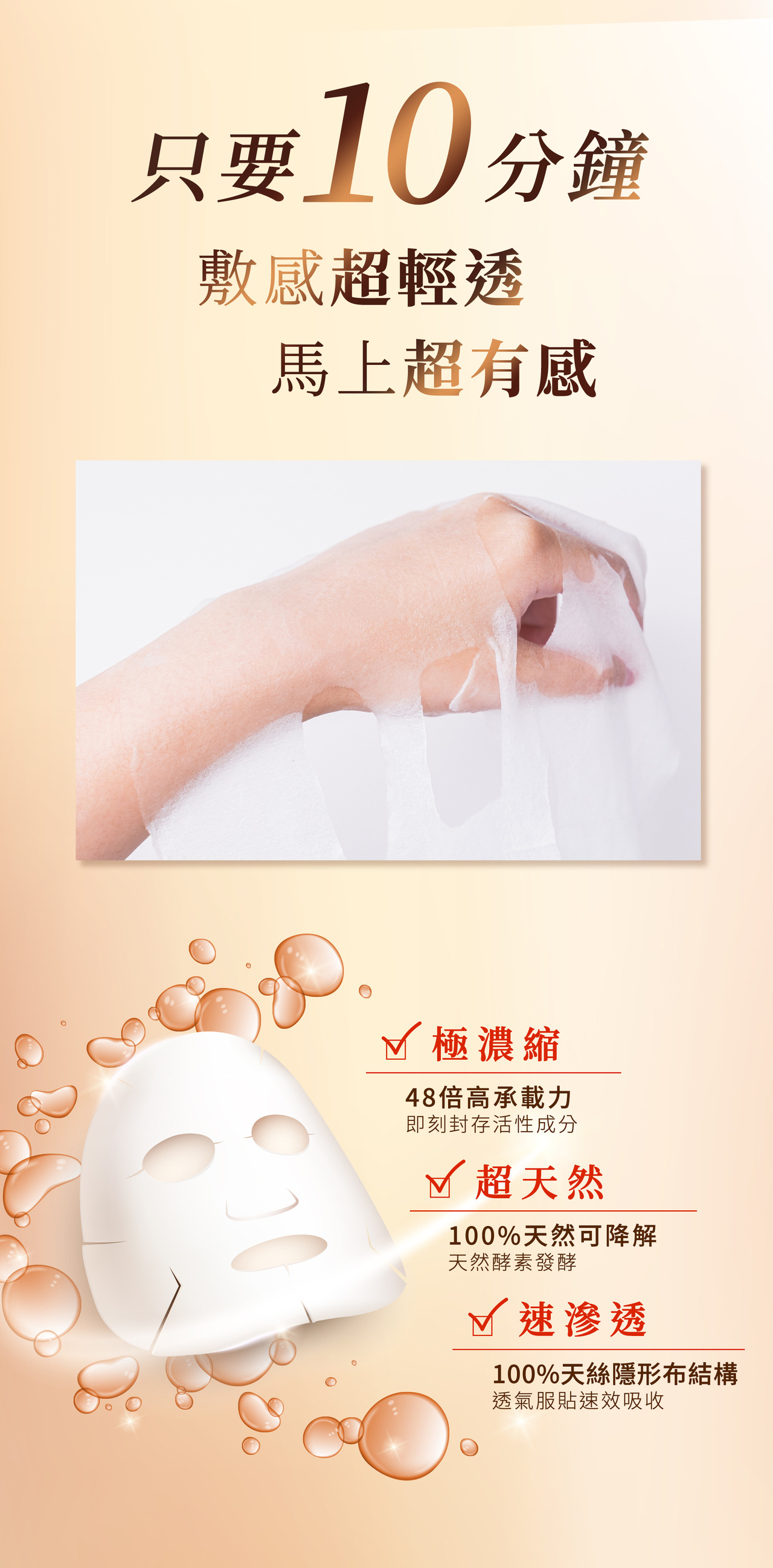 Step 1)  清潔臉部後取出面膜,先撕除外層的珍珠膜,將中間的隱形面膜布貼合於肌膚上,15-20分鐘後取下面膜,輕拍至精華液吸收即可